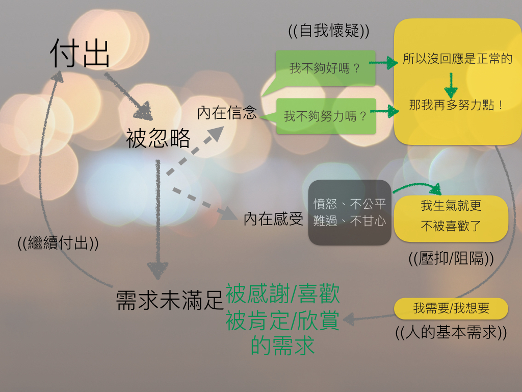 他們往往在付出被忽略時,也選擇忽略自己的內在感受,或者更精確地說,壓抑與阻隔內心所有升起的憤怒、不公平、難過與不甘心的負面感受,因為他們恐懼自己情緒表達之後,會更得不到愛(而這也跟過往的經驗有關)。