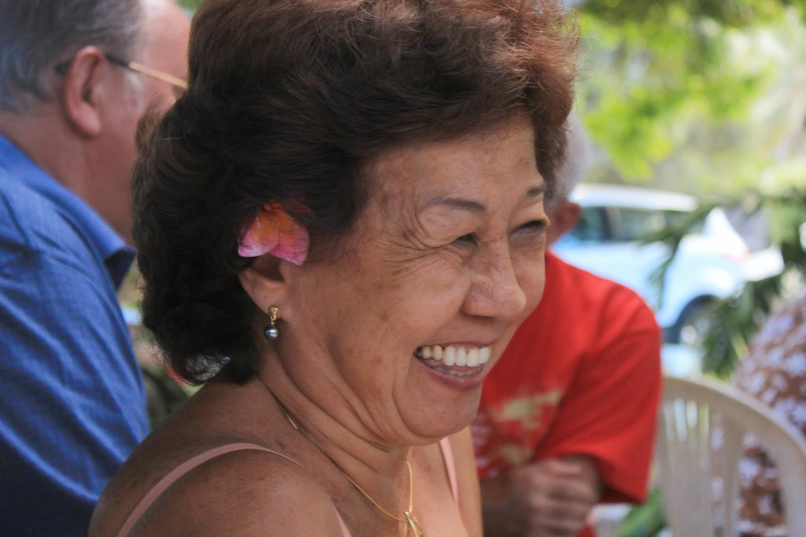許多華人移民的法屬波里尼西亞,雖然乍看之下帶有「每個女人都必須賢慧」的父權思想,每個女人都做的一手好花圈,每個女人都能夠做出好吃的料理,但在我觀察下,這裡的女生在家庭裡反而比較強勢,有種女人講話大聲的感覺。照片上的奶奶,是他們家族朋友中較有權勢的長者之一,那天聚餐就是由她主持禱告.
