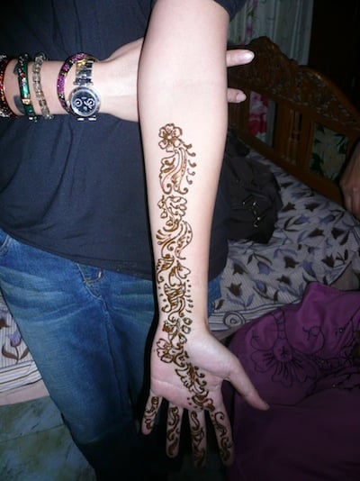 受女孩歡迎的印度手繪,多為花鳥的圖案,為裝扮的一部分。價格依圖案的複雜度而定。印度手繪為新嫁娘必備裝扮,畫越多越複雜越好。