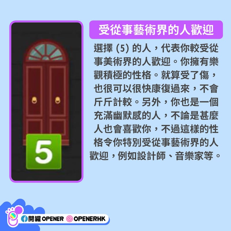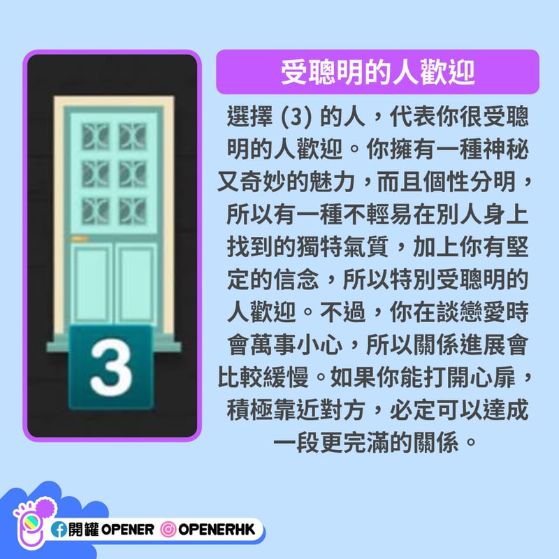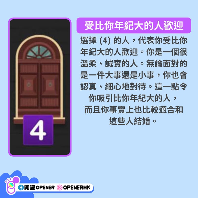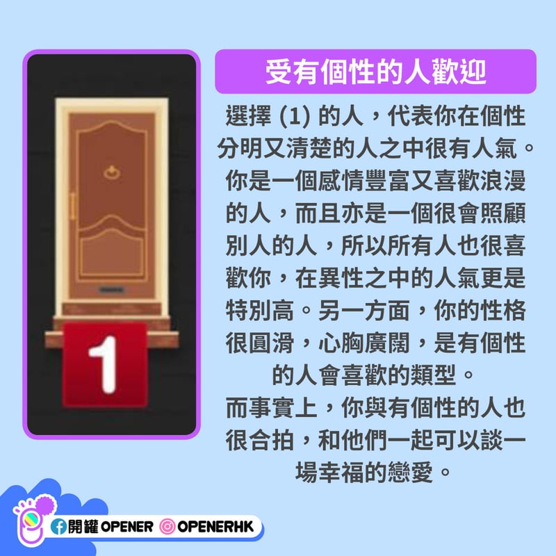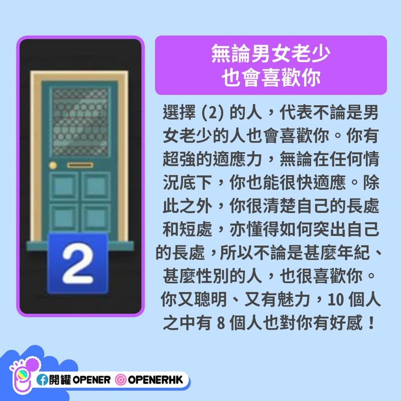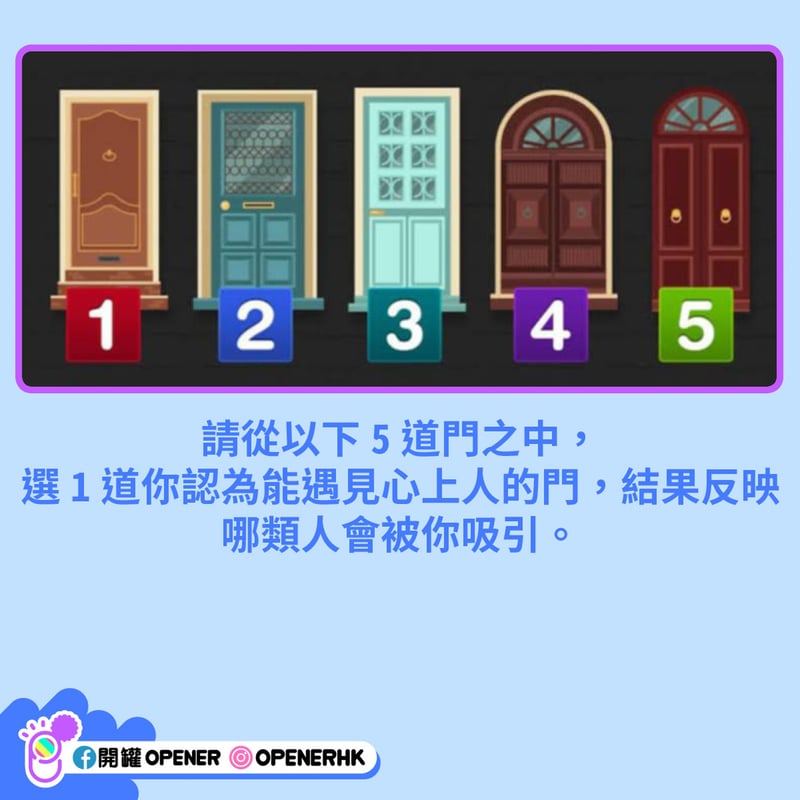 每個人都有獨特的性格和魅力。不過很多時候,連你自己也不知道自己的魅力何在。韓國 vonvon 近日推出一個心理測驗,只要回答一條簡單的問題,就能測出你較受哪類人歡迎,想脫單的朋友不妨測試一下: