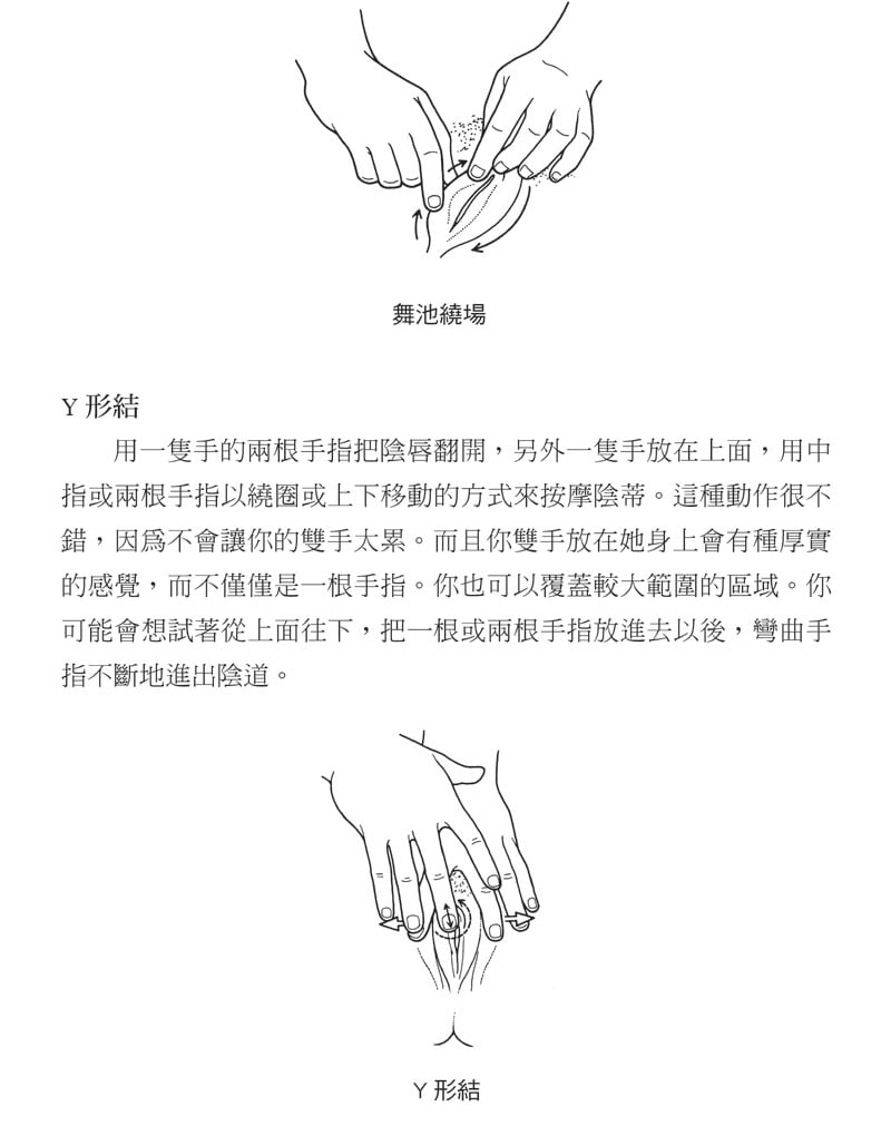 用一隻手的兩根手指把陰唇翻開,另外一隻手放在上面,用中指或兩根手指以繞圈或上下移動的方式來按摩陰蒂。這種動作很不錯,因為不會讓你的雙手太累。而且你雙手放在她身上會有種厚實的感覺,而不僅僅是一根手指。你也可以覆蓋較大範圍的區域。你可能會想試著從上面往下,把一根或兩根手指放進去以後,彎曲手指不斷地進出陰道。(但可不是用力狂戳就可以!這樣才是讓女人舒服的指交方法)