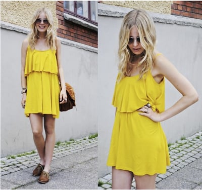 細肩帶連身褲裙今年夏天可是搶足了鏡頭,Blogger 穿的銘黃色荷葉邊款式很有法式浪漫俏皮大牌 Lanvin 的風味,但是這次卻用了許多嬉皮感的飾品來轉換氣氛。主因是銘黃色本身就很容易跟民俗風的飾品搭配,於是 Blogger 用了金屬框飛行員墨鏡帶出流浪者的氣氛!