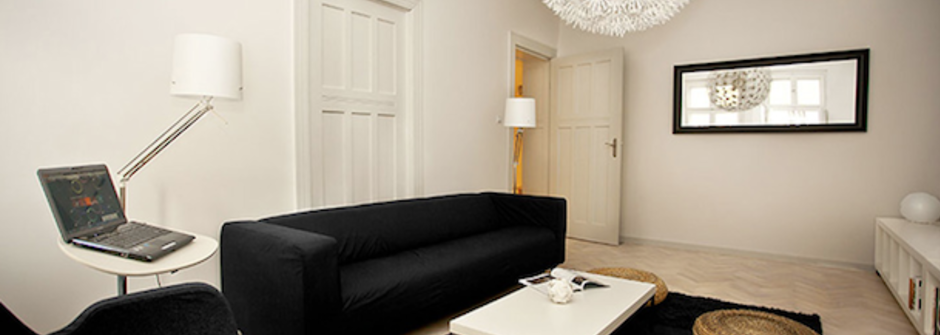 因為這是利用舊公寓改建的快閃旅店,Quotel 有三個公共空間:客廳、餐廳和廚房。客廳他們利用黑色地毯、黑色沙發跟白色吊燈和牆做出對比,輕鬆就有摩登現代的感覺。