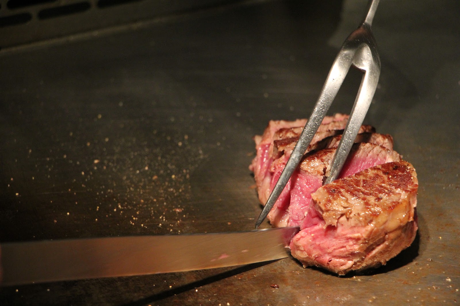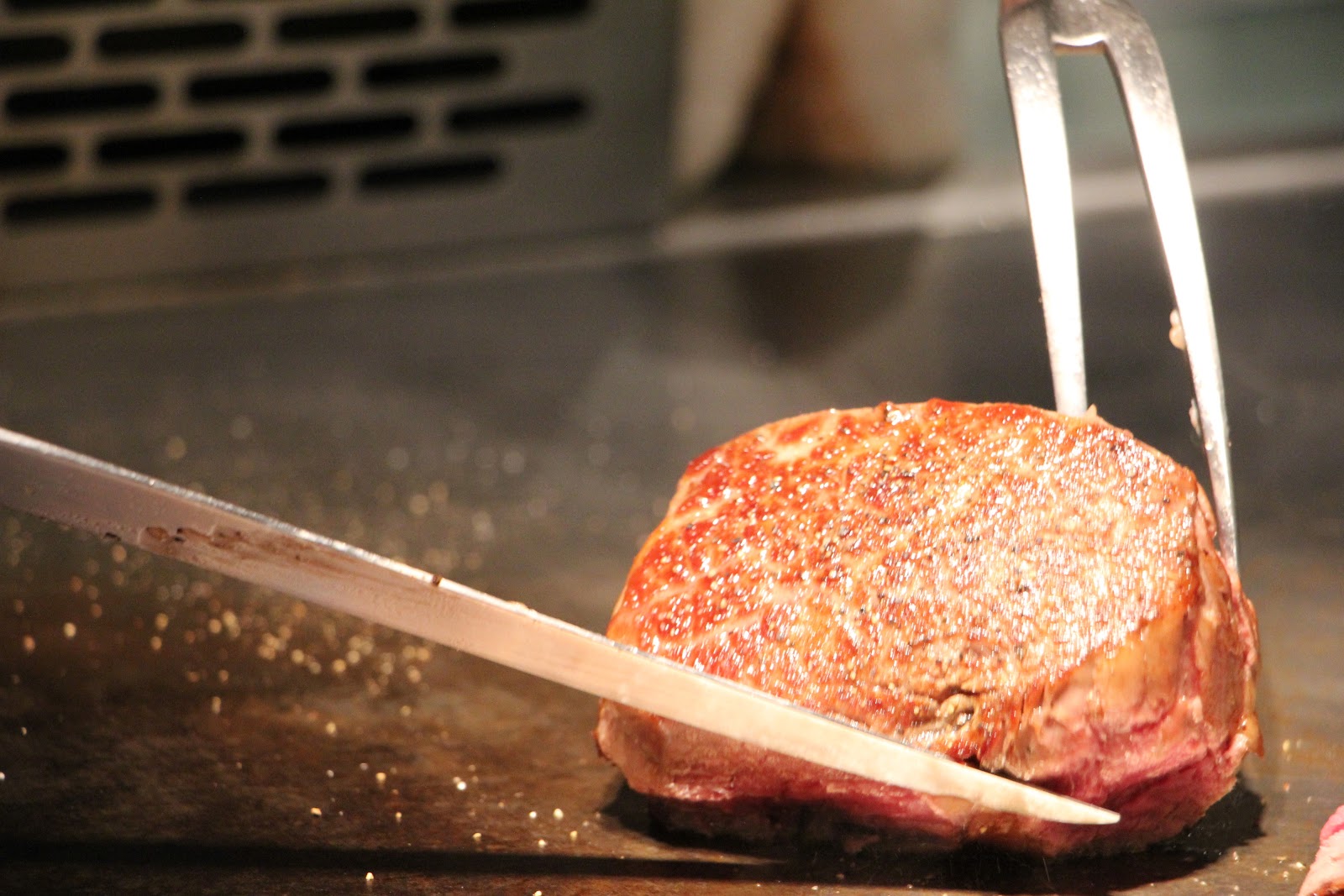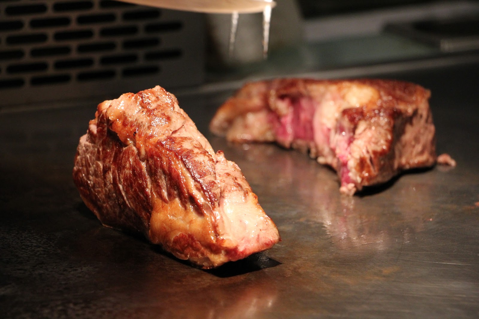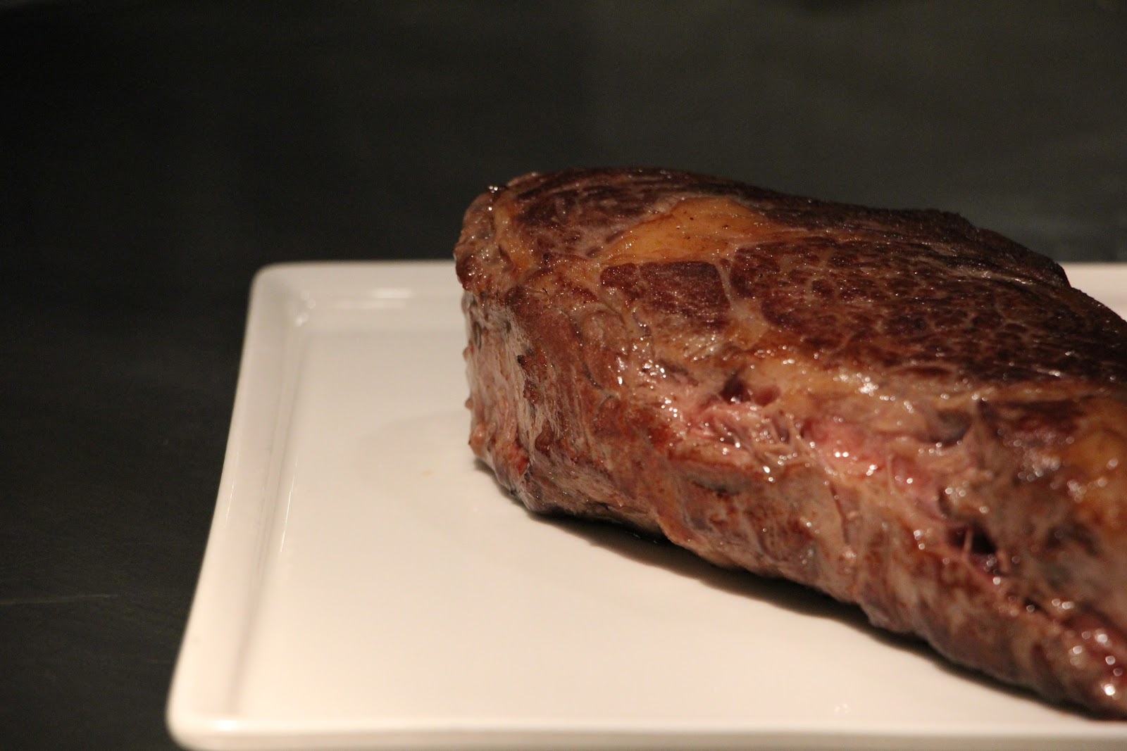 看到20盎司厚切Prime牛排我們真的傻眼,超大塊,以前自己料理過牛排就知道牛肉要掌握熟度很難,更何況這麼大塊!看著主廚不疾不徐的先把半筋半肉拿出來當油煎,不另外添加油,讓牛肉本身的油脂帶出肉質香氣。牛排這次分三個部位享用