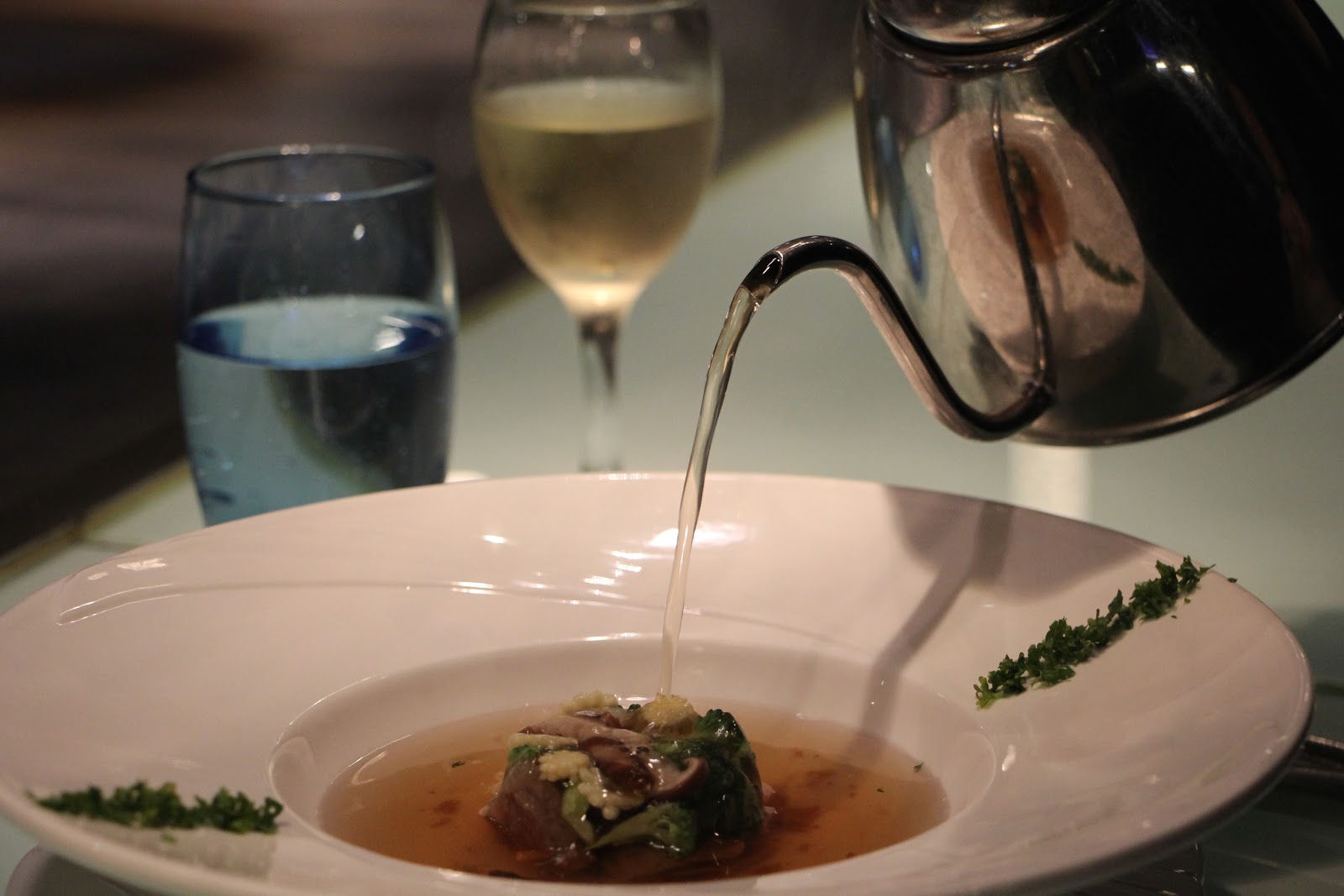 接著就是讓我讚嘆的春蔬晶鑽牛肉湯!超好喝拜託一定要點!用高湯鎖住牛肉精華,底部鋪上炸過的杏鮑菇片和蔬菜,隨著熱湯澆下,慢慢舒展開。喝一口就會品嚐到牛肉的鮮甜跟菇類的爽脆,這次主廚有說10週年整體蔬菜量都有增加,體諒外食族普遍蔬菜量不足的問題。