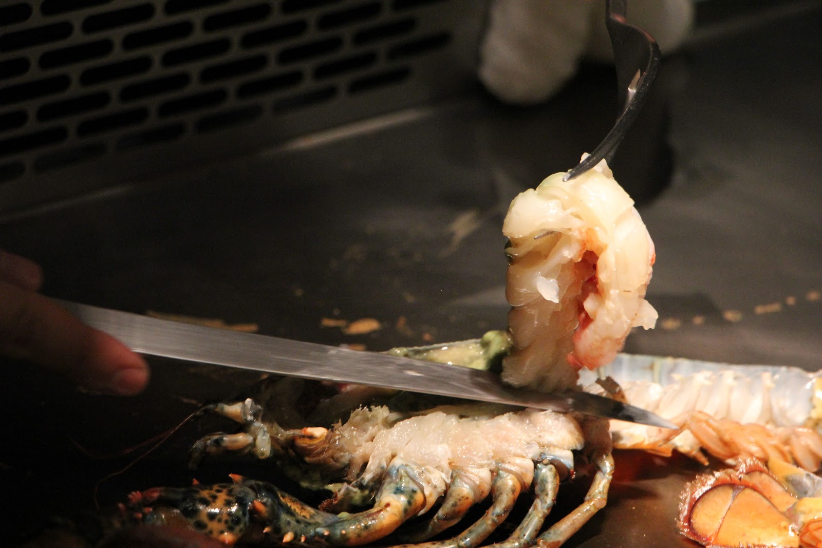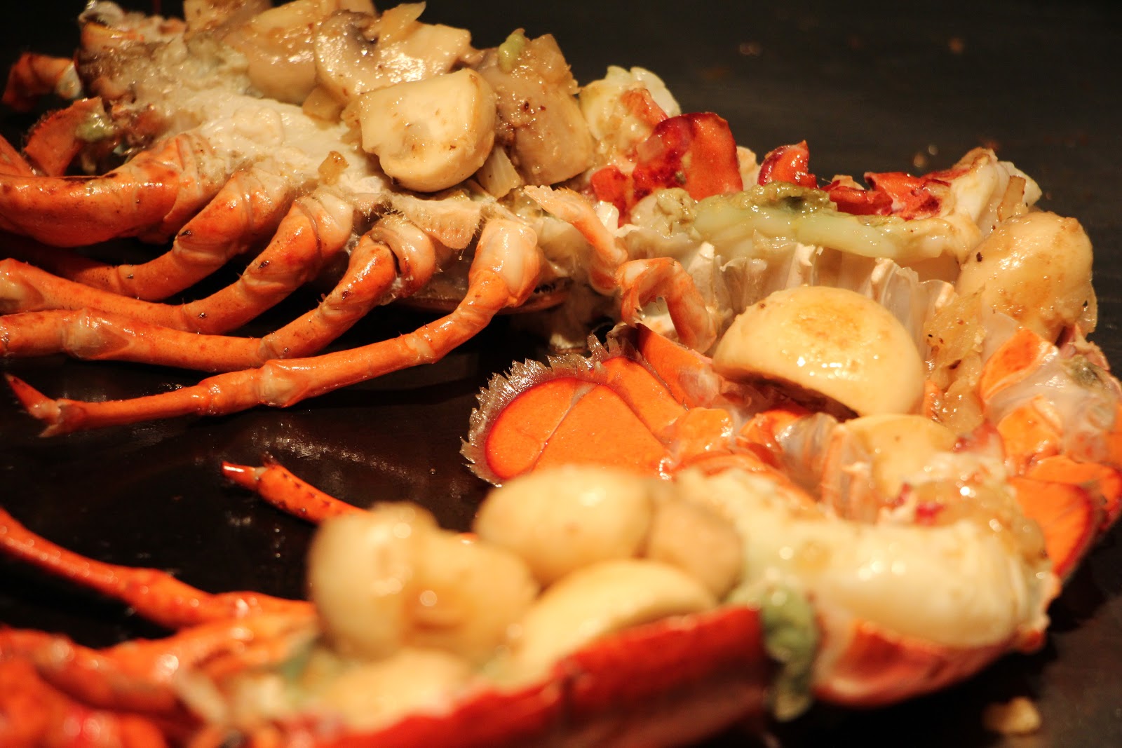 接著是龍蝦秀!!一直很想把這些龍蝦放在頭上跟 Lady Gaga 一樣裝飾(但主廚應該會傻眼),看著他慢條斯理的煎龍蝦,最後灑上磨菇和起司條,蓋上蓋子悶一下,紅通通龍蝦登場了!整體吃起來味道豐富,上層有濕潤的起司磨菇口感,下層龍蝦肉質軟嫩,沾點檸檬提味即可。他們也細心的幫你處理過龍蝦殼,輕鬆用手就能吃到最棒的螯部位。