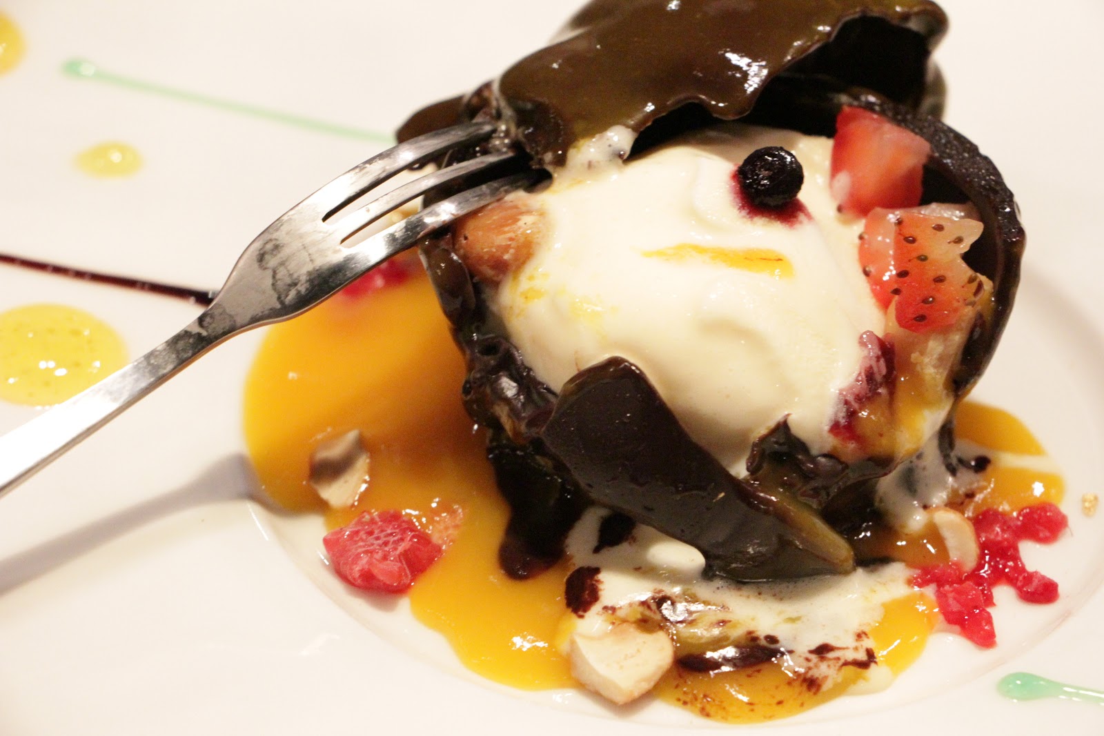 最後這個冰心溶漿就很像蔡依林在鋸蛋,特製超薄巧克力,淋上熱帶水果醬汁瞬間融化,裡面原來藏了水果跟冰淇淋,是道味覺視覺都極有新鮮感的甜點,讓攝影師拍不停!