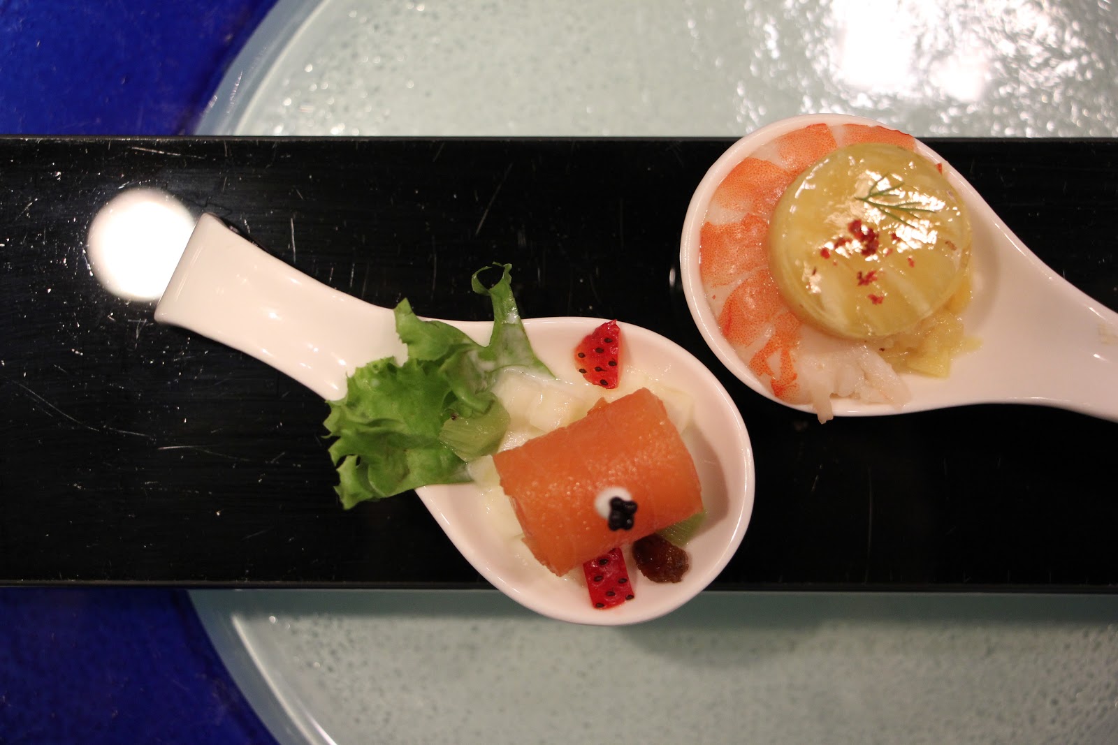 鳳梨鮮蝦晶凍、煙燻鮭魚捲設計成一口吃,超適合懶惰的我!除了不會掉東掉西之外,更能把食材的風味同時揉合在一起,輕鬆開胃。