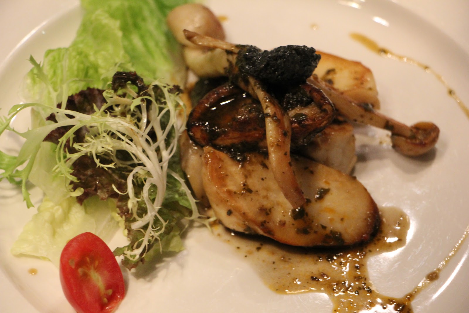 因為我是個菇類控,最後我又點松露百菇沙拉,鐵板現煎的杏鮑菇真的是人間美味,搭配黑松露醬汁濃郁誘人。