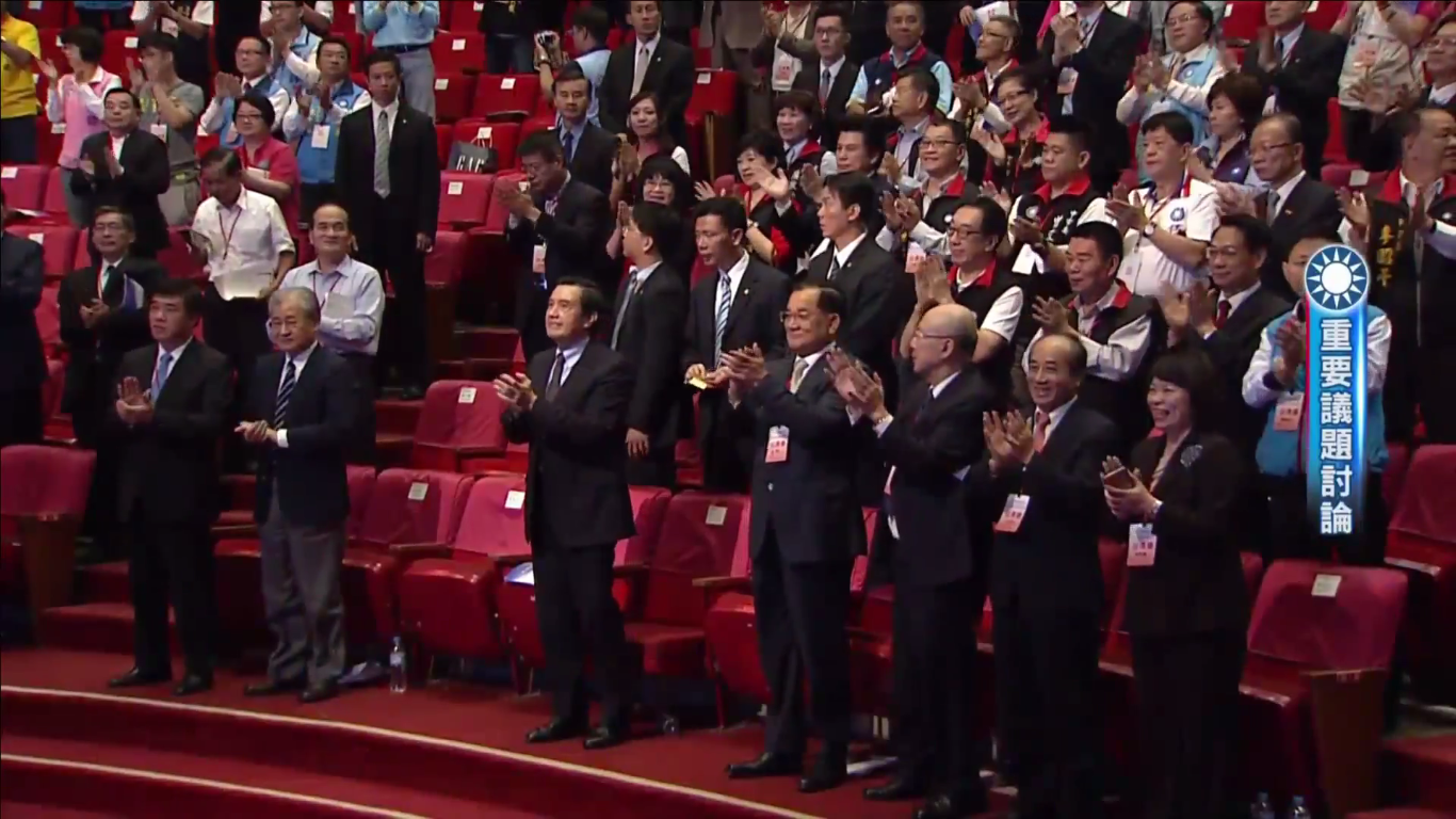 跳過無聊的十位黨代表發言。重頭戲來了。重頭戲果然是令人覺得妙趣橫生。以國民黨過去全大會慣例,所有決議皆以鼓掌通過決策。身為代表台灣民主領頭羊、台灣人民主流價值的國民黨,百年來就是拍拍手代替投票。即便在《中國國民黨中央常務委員會議議事規則》第九條規定:「本會議之表決,以舉手方式行之。必要時得用起立或無記名投票方式行之。」完全沒提到「鼓掌」,拍拍手是違反議事程序正義的。