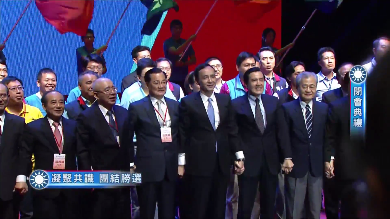 到這裡,咱 Pause 一下,看看台下畫面。鏡頭拉到馬朱連吳王身上,最左邊的馬英九與相鄰的朱立倫,面無表情的似乎在面授機宜什麼;最右邊的王金平一副事不關己地一邊搔著耳朵,一邊笑著與吳伯雄聊天;在正中間的連爺爺面容安詳、坐姿端正的,好像快睡著了。
